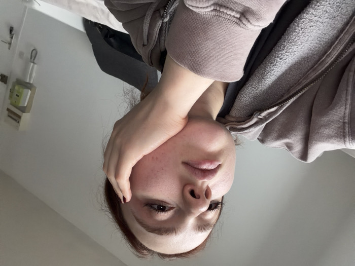 An upside-down view of a woman's face and upper body. She wears a mauve zip-up hoodie and rests her hand against her cheek. The background is a plain, light-colored wall. A partial view of a shelf and items are visible. Her hair is a reddish-brown color.