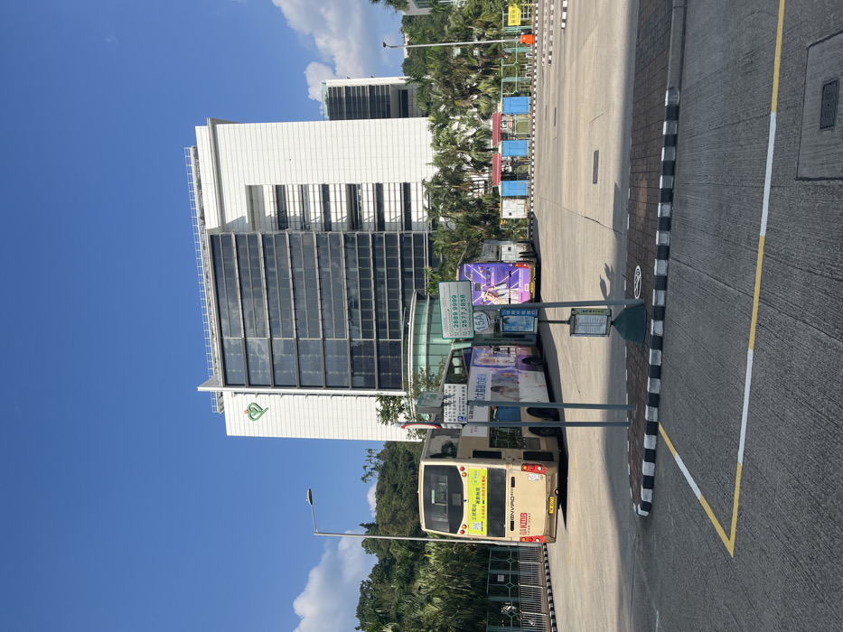 The image displays a daytime scene in the Sai Kung District, China, featuring the Tseung Kwan O Hospital building, a bus terminus, and natural foliage under a clear blue sky