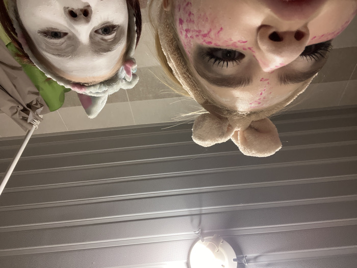 Two individuals, appearing to be young females, are depicted in a close-up, low-angle shot, looking upwards towards the camera. The setting is an indoor space, likely a bathroom, characterized by a light gray paneled ceiling with horizontal textured stripes and a circular, wall-mounted light fixture in the top center. A light-colored tiled wall is partially visible on the right. A white rod, possibly a shower curtain rod or clothes hanger, extends diagonally from the top right, draped with a dark brown/gray fabric and a bright green object. The individual on the left wears a light beige terry cloth headband with prominent, rounded bunny ears. Her face is partially obscured by the low angle, but visible skin has a light base with irregular pink/red markings. Dark eye makeup, including eyeliner and mascara, is evident. The individual on the right wears a light blue/gray terry cloth headband with smaller bunny ears featuring pink interiors. Her entire visible face is covered with a smooth, opaque white substance, consistent with a cosmetic facial mask. Both individuals are engaged in a shared activity involving facial applications. The specific location in the city of Budva, Montenegro, cannot be determined from the visual evidence provided in this image.