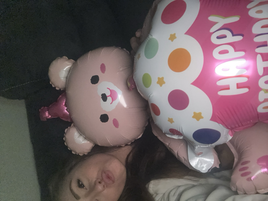 The image displays a partial view of a female individual and two foil balloons in an indoor setting