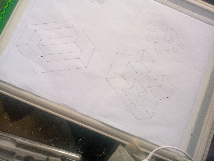 The scene depicts a white sheet of paper affixed to a light-colored drafting board or lightbox within an indoor workspace in the City of Unknown, Unknown. No individuals are present. The paper displays three isometric technical drawings. In the upper-left, a hexagonal outline contains a three-step structure rendered with solid and dashed lines; a small red crosshair-like marker is superimposed on an interior line. A more complex drawing of interconnected cuboid forms, utilizing solid and dashed lines, is positioned centrally on the paper, featuring a small red circular dot near its lower-right corner. A simpler L-shaped block is drawn in isometric perspective in the upper-right section. A ruler or straightedge is visible along the top edge of the paper. The drafting board's frame is light-colored. Below the paper, a dark surface holds a white electrical cable entering from the lower-right and a crumpled piece of light-colored material in the lower-left. Additional metallic components are partially visible in the lower-left quadrant of the image.