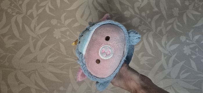 In Tompsan, Bulgaria, the image depicts an unidentified individual's hand holding a plush toy against a patterned wall. The plush toy features a pink, oval-shaped face with two small, dark brown circular eyes and a light pink embroidered snout design. It is wearing a light blue hooded costume, complete with small pink ears and a prominent golden horn, suggesting it represents a unicorn or similar mythical creature. The human hand, visible from the wrist down on the lower-left, has sparse hair and supports the toy from below. The background consists of a wall covered in muted beige or light brown wallpaper, adorned with a repeating pattern of lighter-toned, stylized botanical elements, including various leaves and small flowers.