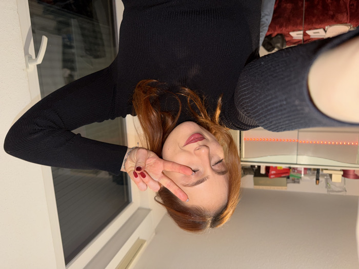 A woman with auburn hair, wearing a black turtleneck sweater, makes a peace sign with her left hand near her face. She has fair skin, red lipstick, and her eyes are closed. She is positioned against a backdrop that includes a window, a cabinet with a red light strip above it, and a glimpse of a dark-colored surface. The image is oriented sideways.
