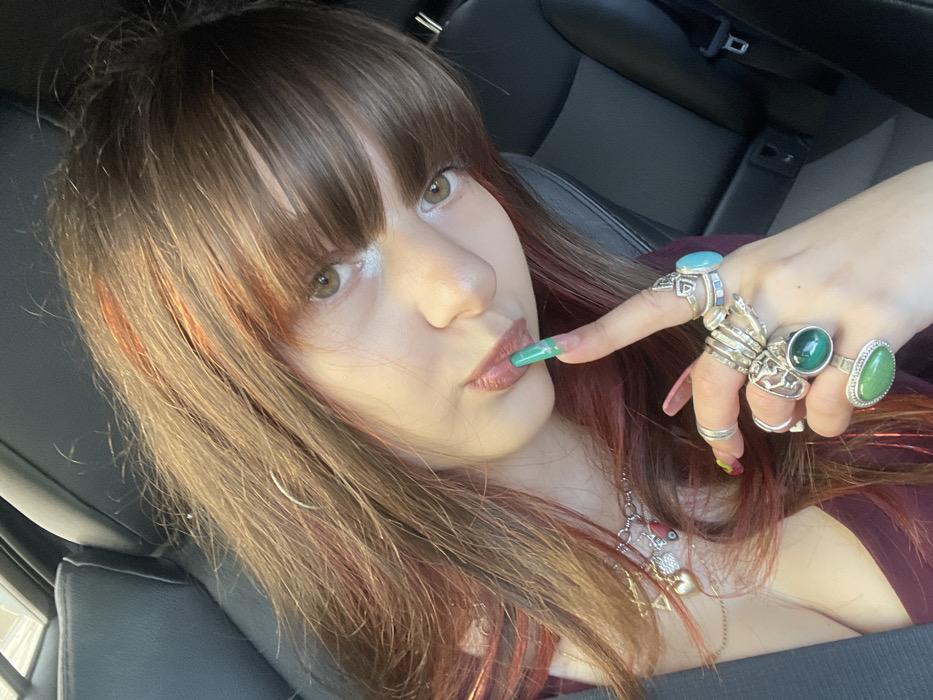 A close-up image depicts a female individual seated within the interior of a vehicle, located in Kfar Saba, Israel. The individual has long brown hair with reddish-orange highlights and bangs, framing brown eyes with a light-colored highlight below the lower lash line. Her lips are coated with brownish-pink lipstick. Her right hand is positioned with the index finger touching near her mouth. Her fingernails are long and sculpted; the right index finger nail features a green design with a lighter accent, while other visible nails have varying colors. Multiple silver-toned rings are worn on her right hand, including several with prominent green and turquoise stones, alongside intricate metallic designs. A silver-colored chain necklace with various charms, including a heart-shaped pendant and an evil eye, is visible around her neck. She is dressed in a dark burgundy or reddish garment. The background reveals black leather car seats and a seatbelt buckle.
