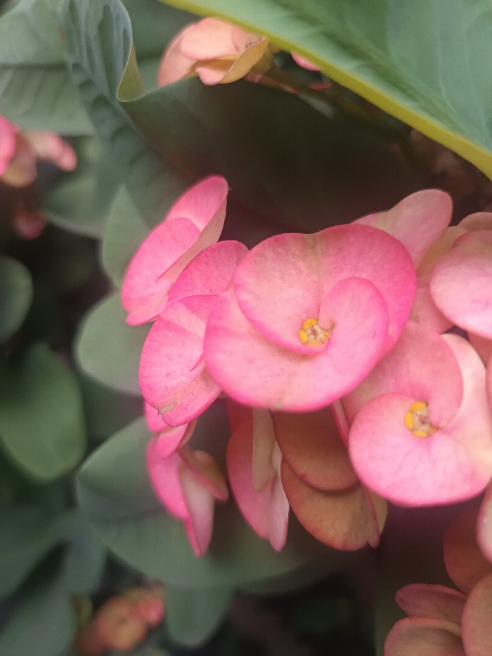 - "This image captures a close-up, high-angle view of multiple pink *Euphorbia milii* (Crown of Thorns) flowers, located in Ouderkerk aan de Amstel, Netherlands" by FM-PvkdH3, licensed under CC BY 4.0