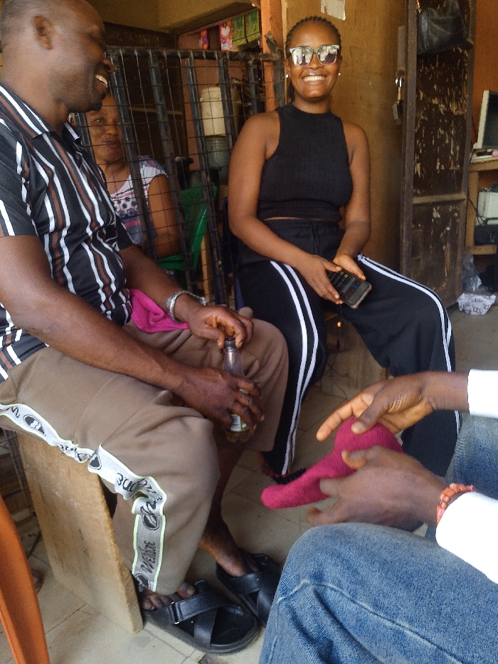 The image depicts an indoor scene within a commercial or informal gathering space in a city. The background features a metal security grate, a wooden wall, and a desktop computer monitor with associated clutter. Three adults are partially visible, with a fourth person indicated by hands in the foreground. On the left, a dark-skinned man with a shaved head is seated on a wooden bench, smiling and looking out of frame to the right. He wears a black and white striped polo shirt, light brown trousers with a patterned white stripe, and black slide sandals. His left hand holds a small glass bottle with a dark cap, and he wears a silver wristband. Behind him, partially obscured by the metal grating, a dark-skinned woman in a patterned top smiles faintly. To the man's right, a dark-skinned woman is seated, smiling towards the viewer. She wears dark sunglasses, a black sleeveless top, and black track pants with white side stripes. She holds a dark smartphone in her right hand. In the lower right foreground, two dark-skinned hands, belonging to a fourth individual wearing blue denim jeans and an orange beaded bracelet, manipulate a pink fabric object.