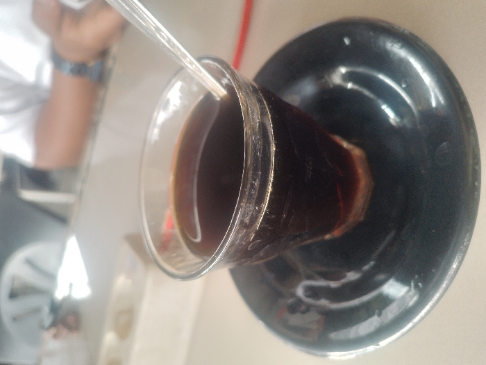 The scene captures a clear glass containing a dark brown liquid, consistent with black coffee, resting on a dark, glossy saucer. A silver-colored spoon is partially submerged within the glass, its handle extending upwards. The bottom portion of the liquid in the glass exhibits a slightly lighter, reddish-brown hue. The glass and saucer are positioned on a light-colored, smooth surface, likely a table. In the blurred background to the right, a person's arm with dark skin is visible, wearing a silver watch with a dark band and a white short-sleeved shirt. To the left in the background, a silver alloy wheel rim of a vehicle and a light-colored power strip are faintly discernible. This scene is situated in Lhokseumawe, Indonesia.