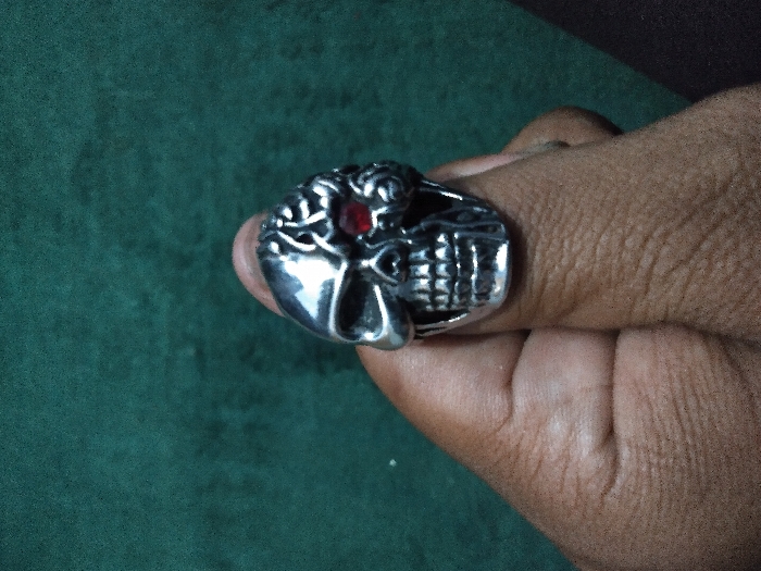 The image displays a close-up of a silver-colored ring worn on a person's thumb. The ring is designed as a skull, featuring intricate details. The right side of the skull (viewer's left) depicts bone structure, while the left side (viewer's right) is stylized to expose brain-like convolutions. A single red gem is set into the left eye socket (viewer's right) of the skull. The skull design includes visible teeth. The thumb, positioned vertically in the center of the frame, exhibits a medium-to-dark brown skin tone, showing creases and texture. The remaining fingers are partially visible at the lower left. The background consists of a soft-focus, dark teal or deep green textured surface, likely fabric, which provides no identifiable environmental details or specific geographical context within Ciudad de San José, Costa Rica. The scene is lit from the front, accentuating the metallic surface of the ring.