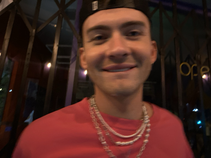The image depicts a young adult male, appearing Caucasian, in a close-up, head-and-shoulders portrait. He wears a dark baseball cap backward, a bright red short-sleeved shirt, and multiple layered necklaces consisting of silver-toned chains and possibly pearl-like strands. A single earring is visible in his left ear. He presents a slight, closed-mouth smile and looks directly forward. The background is dark, indicating a nighttime setting. Behind the subject, a structure with prominent dark metal security bars is visible. To the right, a yellow neon sign partially displays the letters "Ope," consistent with an "Open" sign. Additional blurred lights, including hues of purple, green, and blue, suggest an illuminated commercial interior or street activity beyond the bars. The specific location is identified as The Dresden Restaurant and Lounge, situated at 1760 North Vermont Avenue in the Los Feliz neighborhood of Los Angeles, California, United States, based on the distinctive "Open" neon sign and security bars.