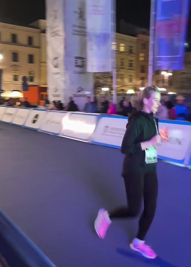 woman jogging along a brightly lit, fenced-off street at night. The street is blue, and lined with sponsor banners such as "GARWIN" and "ASICS" along with barriers. Buildings are visible in the background illuminated by streetlights. A crowd of people watch from behind the barriers. A stage with several bright colorful lights flashes, and a digital sign is visible in the distance. A person's back is visible in the bottom left corner of the frame.