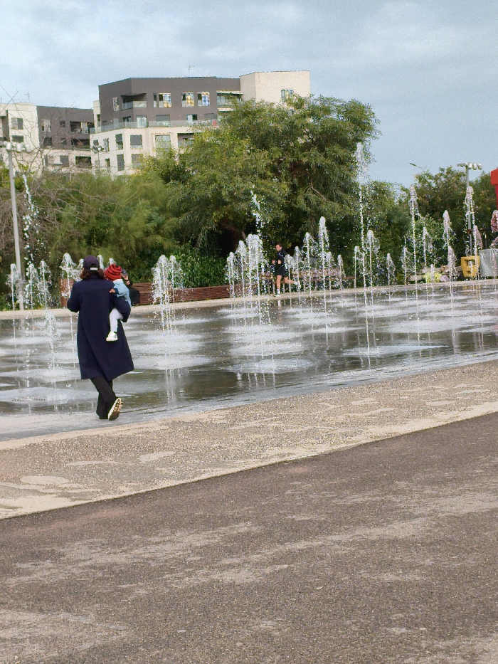 A woman in a navy coat and baseball cap carries a toddler in a red hat across a plaza with many small fountains. Buildings and trees are in the background. Another person jogs behind the fountains. The plaza has a textured grey surface transitioning to darker pavement in the foreground. The sky is overcast.