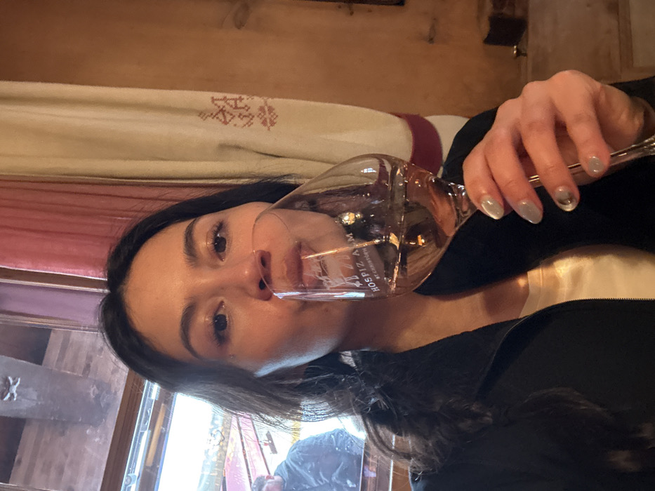 A female subject is depicted indoors, looking directly at the camera, with her lips touching the rim of a wine glass. She has dark hair and is wearing a dark zip-up jacket over a light-colored top. Her right hand, adorned with light-colored nail polish, holds the clear stemmed glass which contains a pale rosé-colored liquid, approximately half full. The glass is etched with "HOSPIZ ALM ST. CHRISTOPH" and a logo. In the upper left background, through a window, a partial view of a blurred male figure in a dark jacket is visible against an outdoor, snowy environment with a red structure. A wooden beam is visible above the window. To the right, a red curtain and a beige curtain with red embroidered patterns hang against a light brown wall. The location is Hospiz Alm in St. Christoph, Austria.