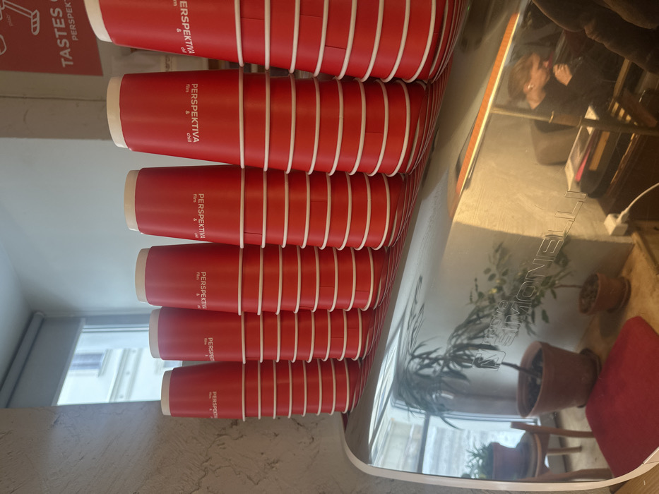The image depicts an interior scene within "Perspektiva film & chill," a coffee shop located at Bol'shoy Karetnyy Pereulok, 24, Moscow, Russia. Six stacks of red paper cups, each with a white interior and rim, are arranged in a row on a highly reflective, silver-colored commercial coffee machine, identified by the "nuova SIMONELLI" logo reflected on its surface. Each cup is branded with "PERSPEKTIVA film & chill." The reflective surface of the machine displays details of the immediate environment: - To the left, a window looking out onto an exterior building and snow is visible, along with three potted plants in terracotta pots, a wooden chair, and a reddish mat. - To the right, the reflection of a person with light-colored hair, wearing a dark top and a white earbud, is visible, appearing to be seated and looking downwards. In the background behind the cups, a textured light-colored wall, a large window with a white frame, a white ceiling, and a partial reddish sign displaying "TASTES OF PERSPEKT" are visible. The scene captures the organized display of disposable cups in a cafe setting.
