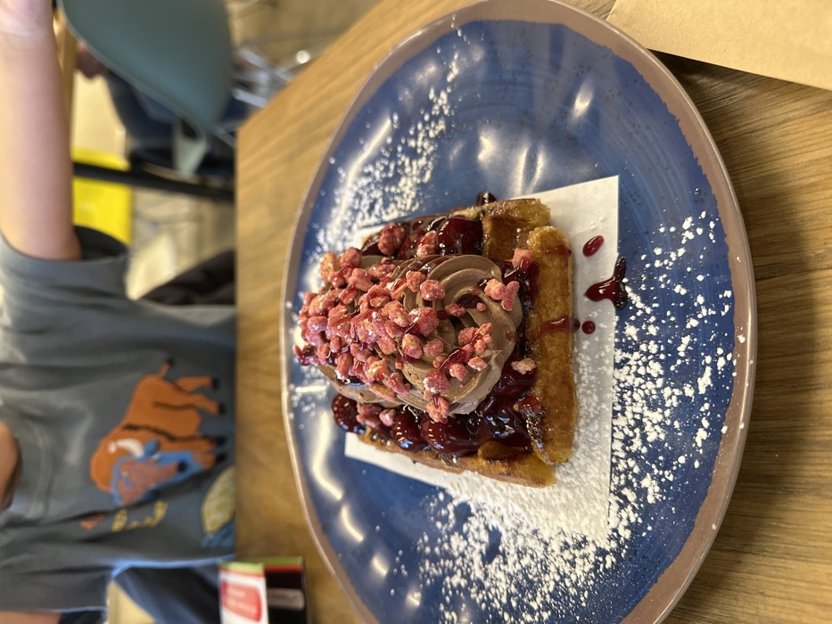 The scene depicts a Belgian waffle presented on a blue ceramic plate with a brown rim, resting on a light wooden table within a cafe or restaurant environment, believed to be located in Brussels, Belgium. The rectangular waffle, golden-brown and textured, is served atop a piece of white parchment paper. It is heavily topped with a dark red cherry compote, over which two dollops of light brown, possibly chocolate-flavored, whipped cream are placed. The whipped cream is garnished with numerous small, irregularly shaped, bright pink crunchy pieces, likely freeze-dried raspberries. Dark red syrup from the compote drips onto the parchment paper and plate. Powdered sugar is liberally dusted around the waffle on both the paper and the blue plate. In the blurred background, a person, possibly a child, is partially visible wearing a light grey short-sleeved t-shirt featuring a large orange bison or buffalo illustration on the chest. Other blurred background elements include yellow and teal chairs and additional wooden table surfaces.