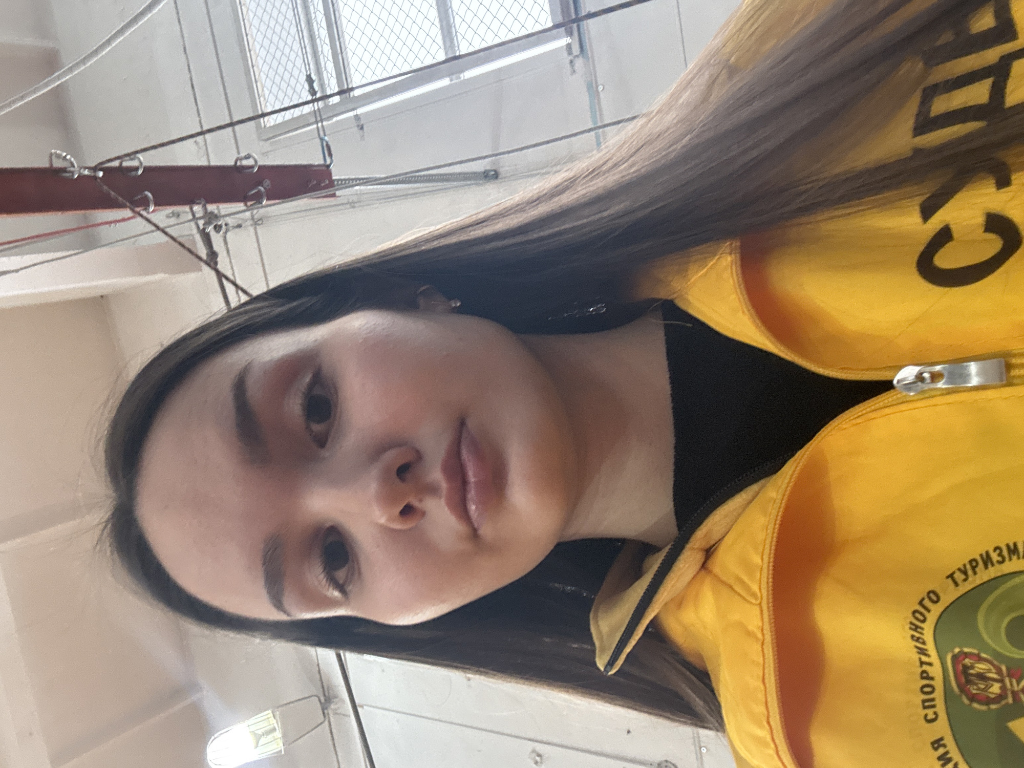 A frontal image depicts a young female, approximately in her late teens or early twenties, indoors within a sports training facility in Tayshet, Russia. The subject has long, straight dark brown hair, parted in the middle, and maintains a neutral expression while looking directly at the camera. She is wearing a yellow zip-up jacket over a black garment. The left chest area of the jacket displays a partially visible circular emblem containing Cyrillic text, which includes "ФЕДЕРАЦИЯ СПОРТИВНОГО ТУРИЗМА" (FEDERATION OF SPORTS TOURISM). On the right chest area, large black Cyrillic letters spell "СУДЬЯ" (JUDGE). The background reveals a light-colored ceiling with a visible fluorescent or LED light fixture to the upper left. A reddish-brown horizontal beam or pipe is present across the upper right portion of the background, from which multiple silver-colored metal carabiners and associated cables or ropes are suspended. This equipment is consistent with a ropes course or climbing training setup. A window with a protective metal mesh or grid is visible in the upper right, allowing ambient light into the space.