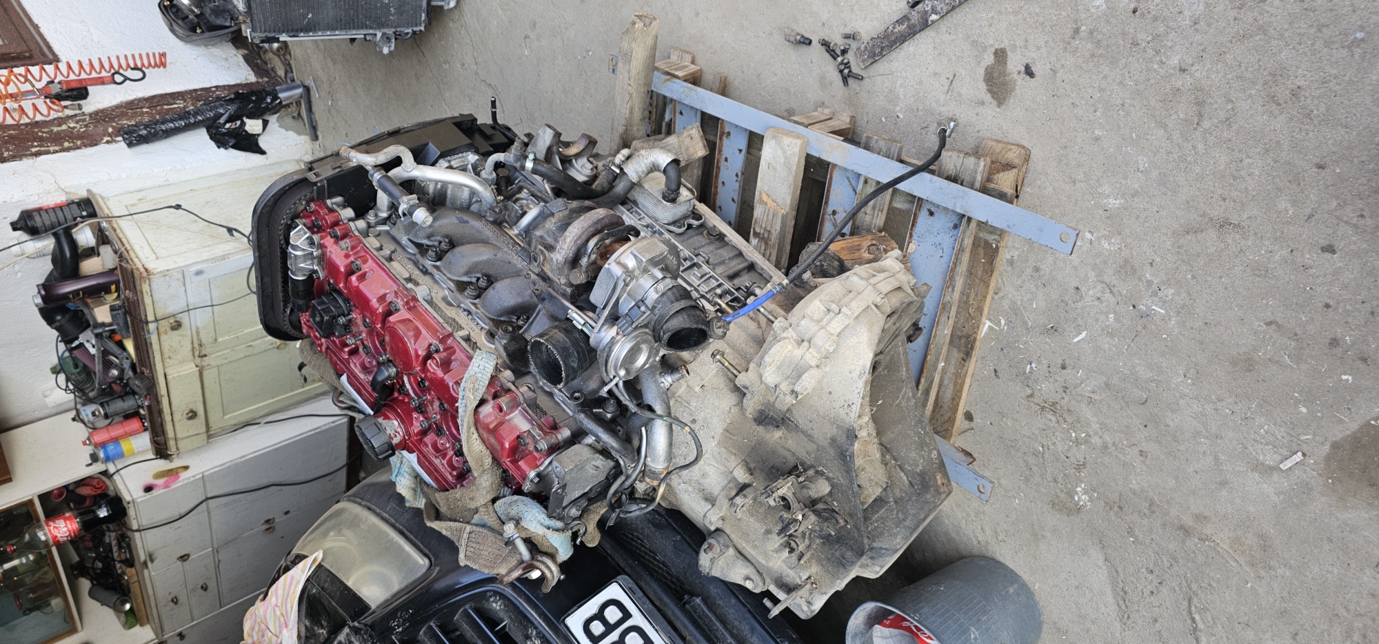 This image captures a cluttered outdoor or open-bay workshop area on a stained concrete slab in Smyadovo, Bulgaria. The central focus is a disassembled vehicle engine with distinctive red valve covers, positioned on two wooden pallets and a grey metal beam. The engine displays multiple components, including visible turbochargers, manifolds, hoses, and wiring. Adjacent to the engine, a dirty, grey transmission unit rests partially on the concrete and a pallet. To the far left, the black front fascia of a vehicle is visible, showing part of a Bulgarian license plate beginning with "B BBBB". In the background, against a white wall, two old, white wooden cabinets are heavily laden with various items, including bottles (one Coca-Cola), aerosol cans, power tools, and miscellaneous workshop supplies. To the right of the cabinets, a section of a brown-painted wooden beam is visible, along with an orange coiled air hose attached to the wall. Further right, a black plastic sheet or bag hangs, and a vehicle radiator leans against the wall. The concrete floor exhibits various stains, oil spots, and scattered debris. No individuals are present, and no actions are actively depicted; the scene represents a static moment in a mechanical work environment.