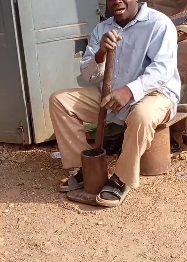 A middle-aged, bald, dark-skinned man is seated on a metal stool outside, engaging in the action of grinding something with a mortar and pestle