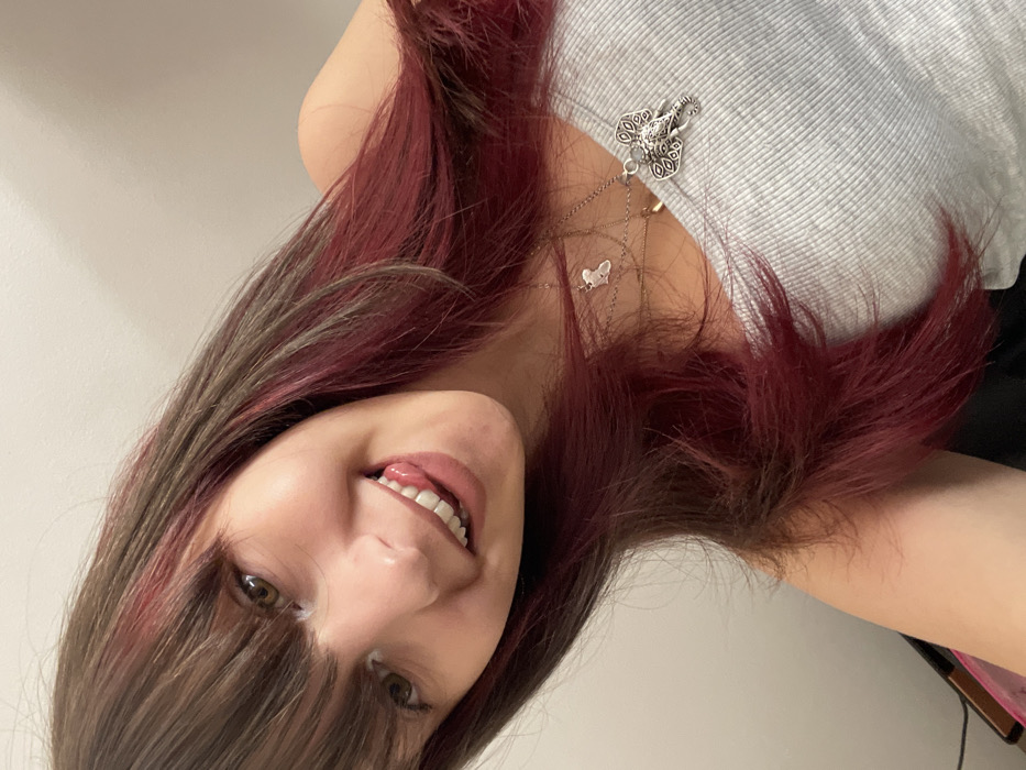 A female individual is depicted in a close-up indoor portrait. She has long brown hair with prominent reddish-purple streaks and bangs across her forehead. Her face is turned slightly, and she is smiling broadly, revealing her upper teeth, with the tip of her tongue partially extended. Her eyes are brown and directed towards the camera. She is wearing a light gray ribbed tank top. Two layered necklaces adorn her neck: the upper necklace features a small, light-colored charm resembling a bear, while the lower necklace displays a larger, silver-toned elephant head pendant with intricate patterns. The background is a plain, light-colored wall, indicating an indeterminate indoor setting. No discernible environmental features are present to identify the specific location as Johannesburg, South Africa, or any other particular city.