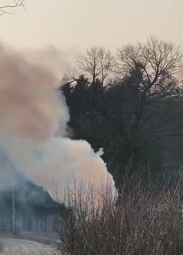 large plume of smoke rising from behind a stand of bare trees. The smoke is white and grey, and appears to be coming from a fire. In the foreground, there are tall, dry grasses and a dirt path. The sky is overcast and the lighting is dim. There are no people visible in the video.