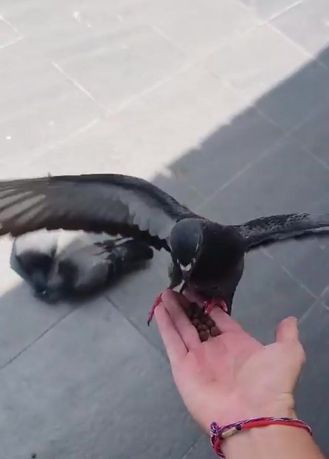- ". A person holds out their hand, full of birdseed, to a pigeon. The pigeon stands on the person’s hand, flapping its wings to maintain balance as it pecks at the birdseed. Several other pigeons loiter on the gray tiled ground around the person’s hand. The scene is outside in bright sunlight. The person wears a red and white patterned wristband." by FM-H4hzl2, licensed under CC BY 4.0