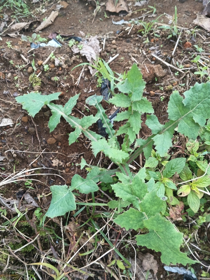 This image presents a close-up, top-down view of ground-level vegetation and soil in Khna, Cambodia. The primary subject is a herbaceous plant with multiple light to medium green leaves, characterized by deep, irregular lobes and serrated edges, positioned centrally and extending across the lower half and mid-ground. The plant exhibits a central stem from which leaves emerge. Surrounding this plant is loose, dark brown soil interspersed with small pebbles, dried organic debris including sticks and fallen leaves, and sparse patches of other, smaller green plants and grass blades. Fragments of dark, non-organic material, possibly plastic, are observable in the upper central portion of the frame embedded in the soil. No human subjects, animals, or significant actions are depicted. The scene is static and illuminated by ambient natural light.