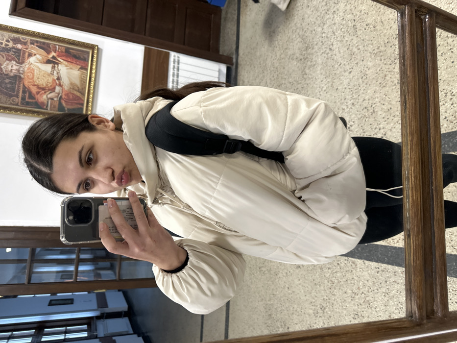 An interior scene depicts a young female taking a mirror selfie within a public institutional building, likely a school or administrative office, located in Vidin, Bulgaria. The female, positioned center-left, has dark hair pulled back and wears a light cream-colored hooded puffer jacket over black leggings, with a black backpack visible on her right shoulder. She holds a silver-colored smartphone with a clear case in her left hand, extended towards the mirror, and her lips are pursed with a small metallic object visible on her lower lip. The floor is composed of light-colored speckled terrazzo tiles. In the background to the left, a long corridor extends, featuring light-colored walls, multiple wooden doors, and windows. To the right, a framed Orthodox Christian icon hangs on the wall, depicting an elderly male saint in ornate gold and red robes, wearing a crown and holding a staff. A white heating radiator is mounted on the wall below the icon, and a dark wooden door frame is partially visible on the far right. A wooden mirror frame borders the bottom and sides of the reflection.