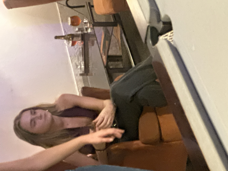 - "An individual with long, straight light brown hair, wearing a dark plum halter-neck top and dark gray trousers, is seated in a rust-colored armchair" by FM-Idd9d2, licensed under CC BY 4.0