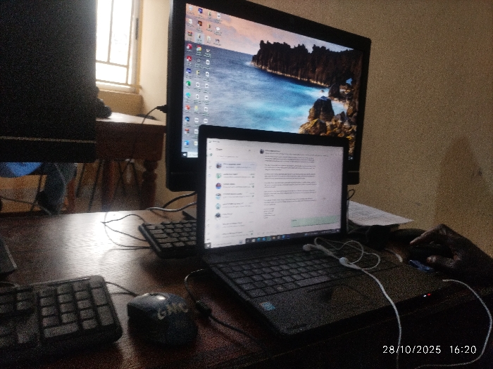 The image, dated 28/10/2025 16:20, depicts an indoor workspace in the city of Unknown, Unknown. A dark wooden desk in the foreground features an open black laptop displaying a chat application, with white wired earphones resting on its keyboard. A black computer mouse, branded "GMC," and a separate black numerical keypad are positioned to the left of the laptop. A dark-skinned hand operates the mouse. Behind the laptop, a large black monitor displays a desktop with a rocky coastline wallpaper and numerous application icons. A second black monitor is partially visible on the far left. The background reveals a light-textured wall with a window featuring vertical bars, through which a wooden table and a person's lower leg, clad in blue fabric, are partially visible.