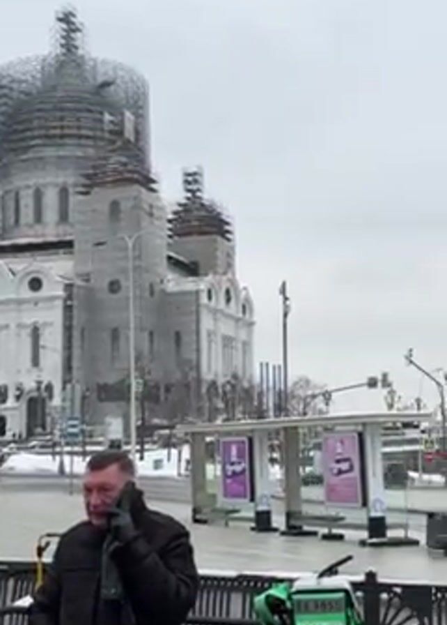 cityscape on a snowy day. Initially, a man in a black coat is seen talking on a cell phone in front of a large white church with scaffolding around its domes. The camera pans to the right, showing a bus stop and a street with traffic and pedestrians. Then, it focuses on a statue covered in snow, positioned near a crosswalk with people crossing. The overall environment appears to be urban, with architectural elements indicative of an older city under a blanket of winter snow.