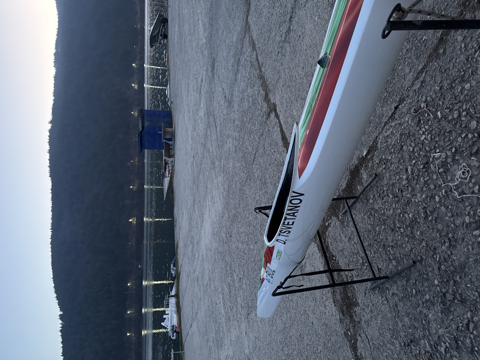 The image depicts a waterfront scene at dusk or early morning, located in Pancharevo, Bulgaria. In the foreground, a white competitive sprint canoe or kayak rests horizontally on a black metal boat stand on a textured concrete surface. The boat features green, white, and red stripes along its side, resembling the Bulgarian national flag. The name "D. TSVETANOV" is printed in black capital letters on the hull, along with "NELO" and "BUL" accompanied by a small Bulgarian flag emblem. A loose, light-colored rope lies coiled on the concrete near the boat's stern. The midground features a large body of water, likely a lake or reservoir, reflecting distant lights. To the left, a white recreational boat, possibly a motorboat, is moored or partially submerged near the concrete edge. Towards the center-right, a small, blue, box-like structure, potentially a hut or storage shed, sits on a pier or platform extending into the water. A wooden table and chairs are positioned next to this structure. Further right, a small boat, possibly on a trailer, is visible near the shoreline. The background consists of dark, tree-covered hills or mountains silhouetted against a pale sky. A line of illuminated streetlights or similar fixtures is visible along the distant shore, casting prominent vertical reflections across the water's surface. No individuals are present in the scene.