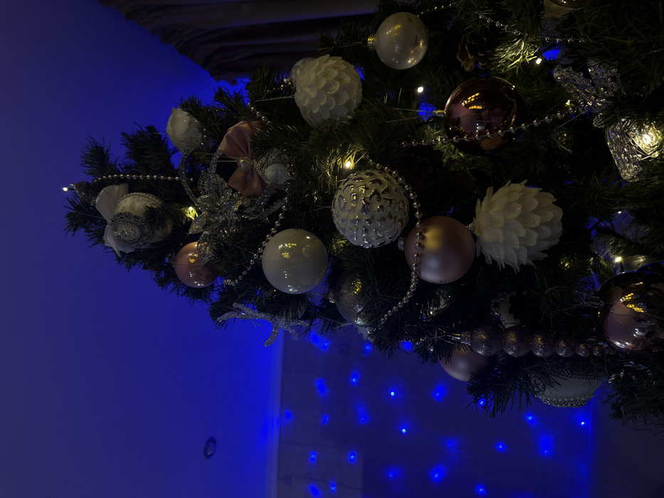 A lush Christmas tree adorns a room, its branches draped with a glittering silver garland and a variety of ornaments. Soft white and gold orbs mingle with textured, flower-like baubles. Some have a rosy blush. A string of delicate lights twinkles among the needles, reflecting in the polished surfaces of the ornaments. Blue light shines from the walls, casting a cool hue on the scene.