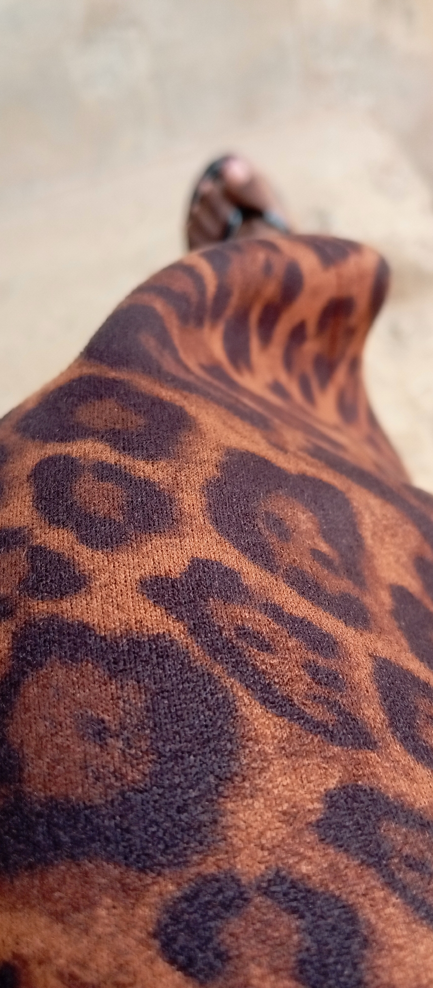 Close-up shot of a person's upper arm wearing a brown and black leopard print shirt