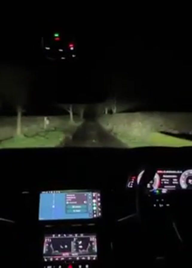 car driving at night. The view is from the driver's seat, looking out the windshield. The road ahead is dark, but the car's headlights illuminate the road and the trees lining it. The dashboard is visible, with the navigation system showing a map. There are several buttons and dials on the center console. The car is moving forward on a dark, tree-lined road. The interior lights of the car are on. The car's headlights illuminate the path ahead. There is a navigation system on the dashboard. A hand is visible on the steering wheel.
