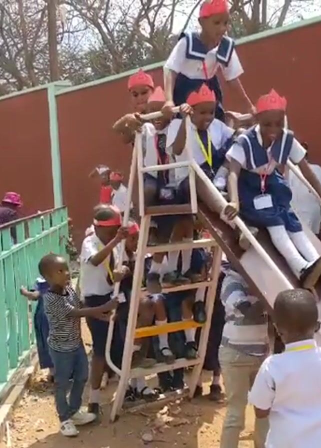 A playground scene unfolds with a group of children, mostly in school uniforms, gathered around a metal slide structure