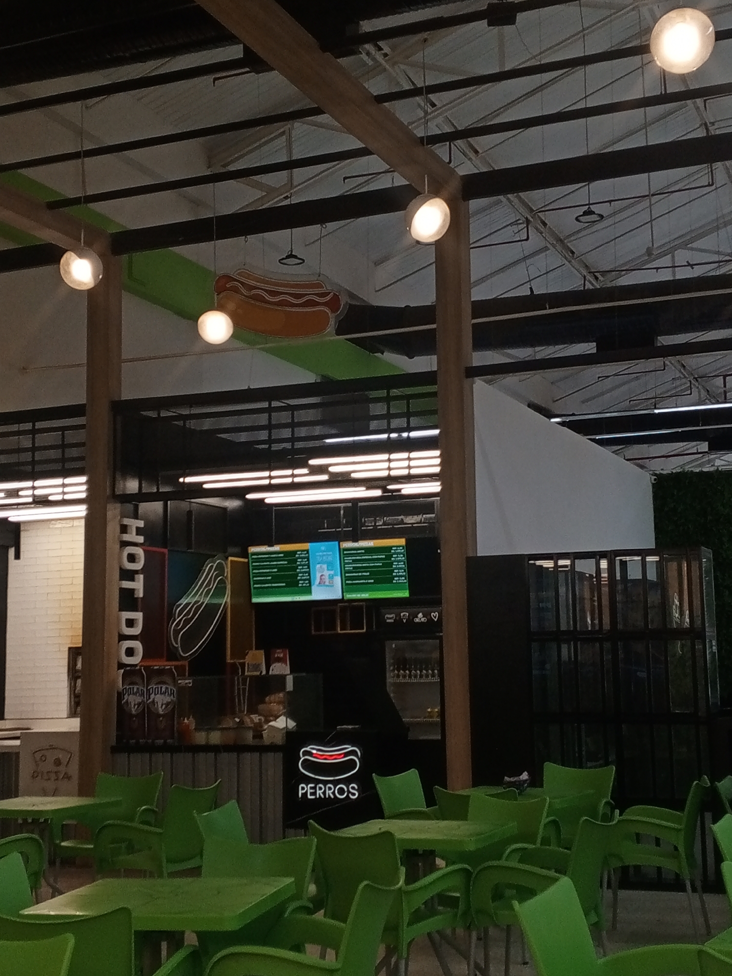 n interior view of a food establishment in Porlamar, Venezuela, featuring seating arrangements of green tables and chairs. Overhead lighting consists of suspended globe lights and linear fluorescent fixtures. Signage indicates the presence of "Hot Dog" and "Perros" (Spanish for dogs) offerings. Menu boards are visible above the food counter. A large hot dog sign is visible. The environment has an industrial-style ceiling with exposed beams and ductwork. A white wall and decorative green foliage are present in the background. There are no people visible in the scene.