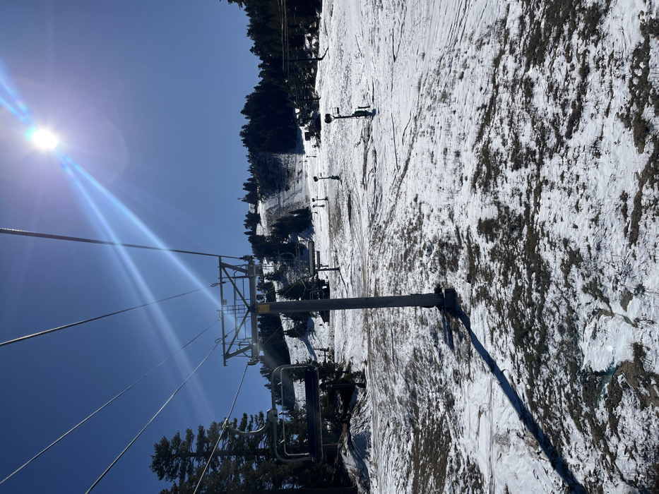 A low-angle shot showcases a ski lift ascending a mountain. The sun blazes in a clear blue sky, casting a strong lens flare. The mountain is partially covered in snow, with patches of dark earth visible. Trees line the slopes, appearing more densely packed further up the mountain. Ski lift towers and cables dominate the foreground, conveying a sense of movement and elevation.