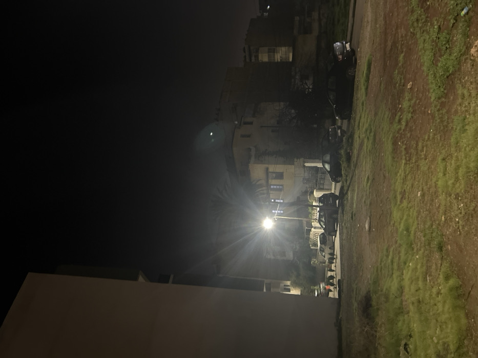 A night scene features buildings illuminated by a street light. Cars are parked along the roadside near a grassy area. A tall, white wall is visible in the foreground. The light casts a bright glow, creating stark contrasts against the dark sky. The scene captures a quiet urban moment.