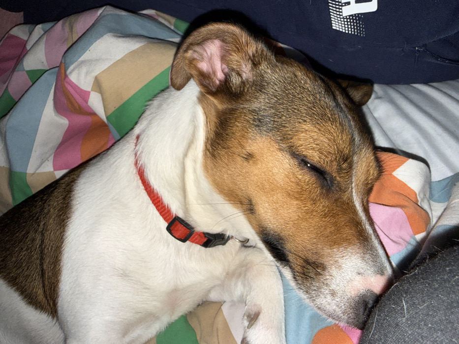 - "A brown and white dog, consistent with a Jack Russell Terrier, is depicted lying on its left side, appearing to be asleep or resting, with its eyes partially closed" by FM-IF0662, licensed under CC BY 4.0