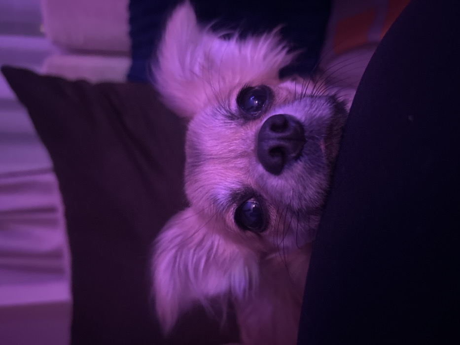 - "A close-up, eye-level image depicts a small, long-haired canine, consistent with a Chihuahua breed, with light-colored fur, resting its chin on a dark, plush surface" by FM-9lrff1, licensed under CC BY 4.0
