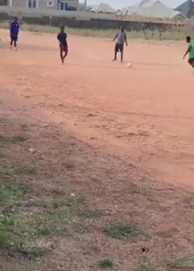 group of young men playing soccer on a dusty, reddish-brown dirt field. There are five people visible, four on the field and one acting as a goalie. The players are dressed in a variety of athletic clothing, and the game appears casual. In the background are houses with grey roofs. A wall of concrete blocks runs along the near side of the field.