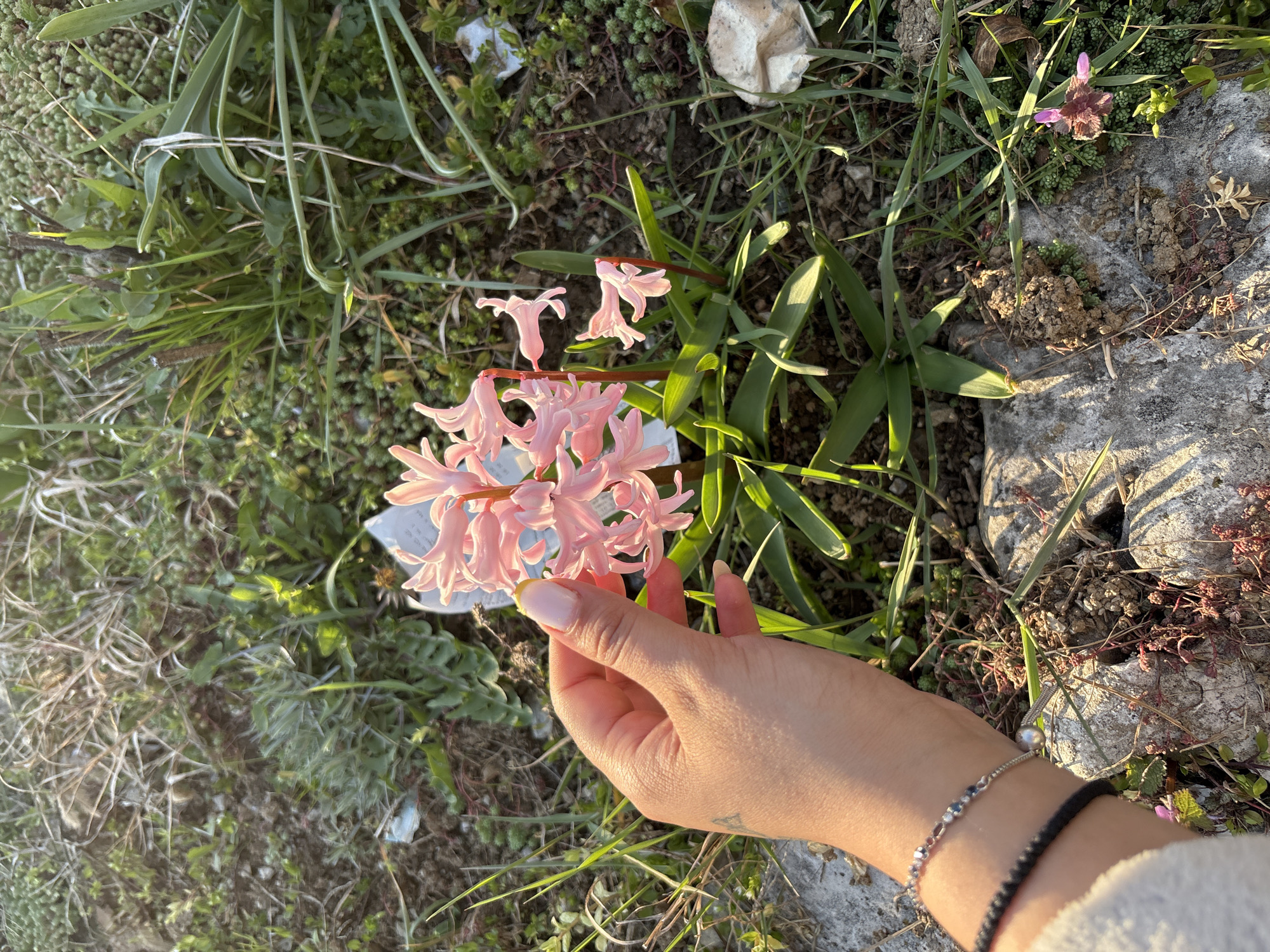 In Shumata, Bulgaria, a close-up outdoor scene displays a human hand interacting with a flowering plant. The hand, consistent with a female, exhibits light skin, manicured fingernails with a light pink base and yellow tips, and a faded geometric tattoo (appearing triangular) on the inner forearm. The wrist wears two bracelets: a black beaded or string bracelet and a silver-colored metal bracelet featuring small blue accents and a spherical charm. The hand is positioned, fingers cupped, gently supporting a prominent cluster of light pink, bell-shaped flowers, identifiable as hyacinths, which are in full bloom. The flowers originate from a plant rooted in dark soil, surrounded by a diverse assortment of green vegetation, including various grasses and low-lying ground cover. Scattered throughout the immediate environment are several light-colored, irregular rocks. A small, singular faded purple flower is also visible among the ground cover. Small pieces of white discarded material, possibly paper or thin plastic, are interspersed within the foliage on the ground. The scene is illuminated by direct natural sunlight, suggesting either morning or late afternoon light conditions.