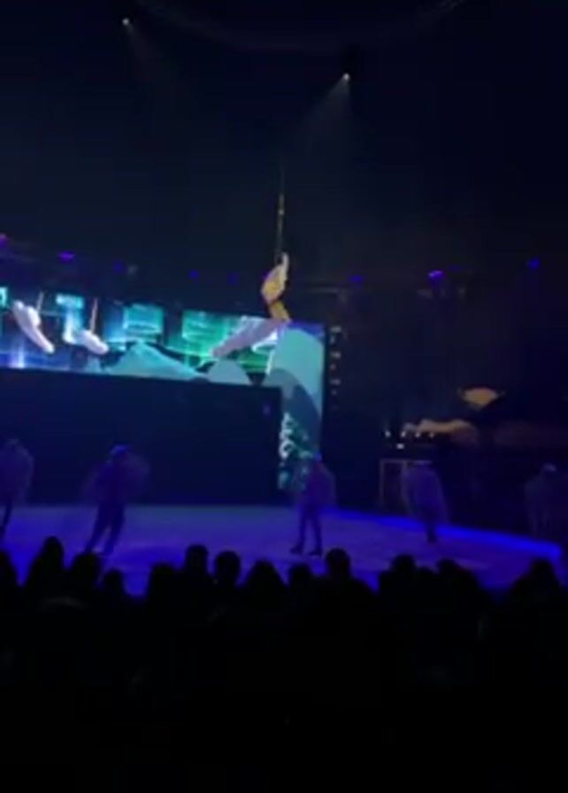 An aerialist is performing on a hoop suspended from the ceiling in front of a large screen displaying digital graphics. The performer is wearing a white outfit. On the stage below, several figures are moving around. The stage is bathed in blue and purple light. A large audience is watching the performance from below, their silhouettes visible in the dark.