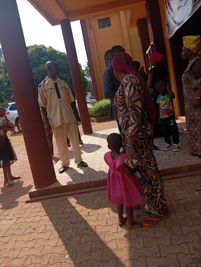 A group of people stand outside a building with brown pillars. One man in a light-colored shirt and pants is facing left. A woman in a patterned dress is holding a child in a pink dress. Other people are nearby, including children. A car is visible in the background. The scene is bathed in sunlight, casting strong shadows on the brick pavement.