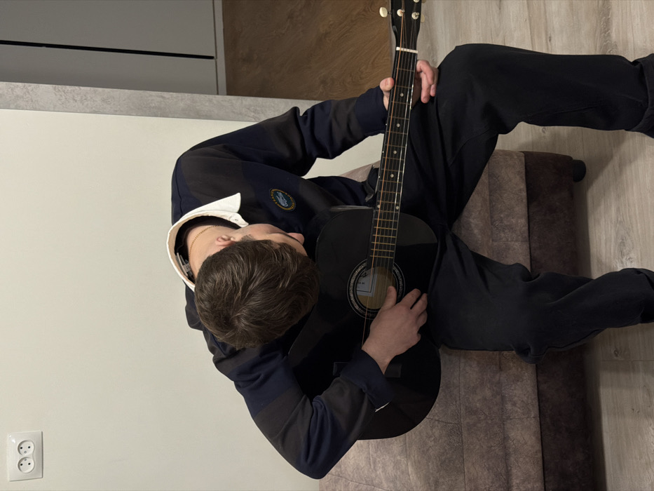 The scene depicts an indoor setting in Yuzhny, Russia. A male individual is seated, bent forward, focused on a black acoustic guitar he holds. He is dressed in a navy and black striped long-sleeved polo shirt with a white collar and a visible logo on the left chest, complemented by dark trousers. A gold-colored chain is around his neck. His left hand is positioned over the guitar's strings near the soundhole, while his right hand grips the neck near the headstock. He sits on a brown upholstered bench or ottoman. The background consists of a plain, light-colored wall featuring a white double electrical outlet in the upper left. A light wood-effect floor is visible, along with a darker vertical architectural element to the right, suggesting a doorway or partition.