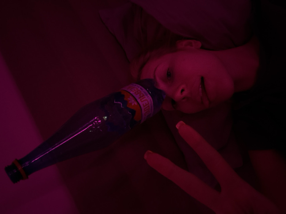 The image depicts a female-presenting individual lying supine in a dimly lit, indoor environment, saturated with magenta light, likely within Vsevolozhsk, Russia. A clear plastic bottle, bearing a label with Cyrillic text including "ЭДЕЛЬВЕЙС" (Edelweiss) and mountain graphics, is balanced on the individual's forehead. The subject's face is visible, with open eyes and her tongue slightly extended from her mouth. Her left hand is raised to the left side of her head, forming a "peace sign" with the index and middle fingers extended. The nails on the extended fingers are painted. The background appears to be soft upholstery or bedding, consistent with a residential interior.