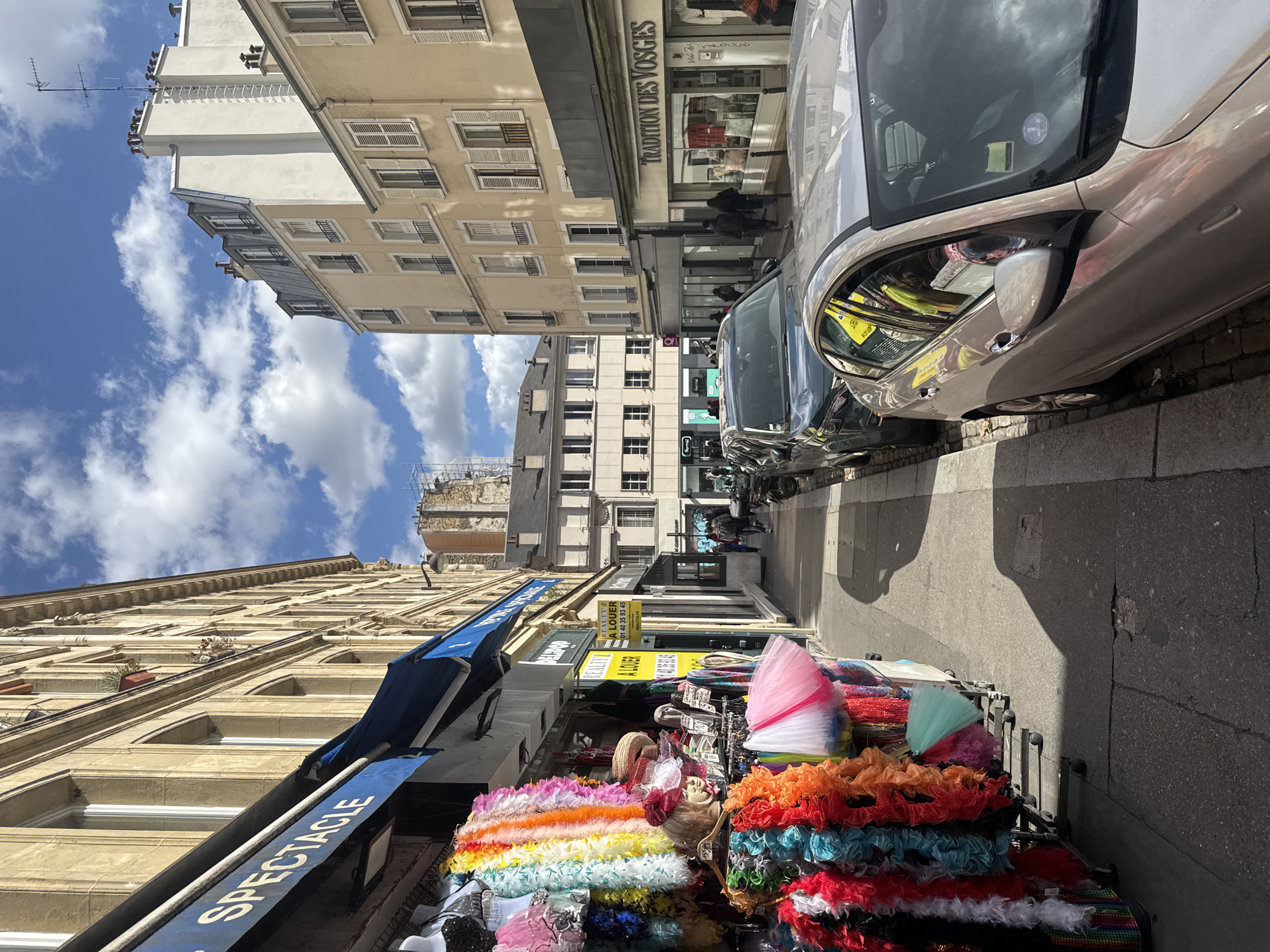This image depicts a sunlit Parisian street scene, likely in the vicinity of Place des Vosges in the 4th arrondissement. The scene is viewed from a low angle on the left sidewalk, looking down a street lined with multi-story buildings under a blue sky with scattered white cumulus clouds. On the immediate left, a sidewalk display rack is filled with numerous brightly colored feather boas and tulle tutus in shades of pink, white, blue, orange, red, green, yellow, and purple. A mannequin head wearing a hat is visible among the items. This display is in front of a storefront with a blue awning bearing the white capital text "SPECTACLE." Further down the left sidewalk, another storefront displays a yellow "A LOUER" (For Rent) sign with contact information for "REALTYZ." The buildings on the left are tall, light-colored structures with multiple windows, some featuring decorative elements and small planters. On the right side of the street, a light-colored sedan is parked parallel to the curb, with its roof and passenger side visible in the foreground. Behind it, a dark-colored SUV is also parked. The sidewalk on the right features several pedestrians walking away from the viewer in the mid-ground. One pair walks past a storefront with a dark awning and a sign that reads "TRADITION DES VOSGES" in white capital letters, showcasing clothing in its display window. Another storefront further down the street is labeled "Normal." The buildings on the right are primarily light beige/cream, featuring numerous windows, some with white louvered shutters. In the background, buildings with varied architectural styles are visible, including one with a mansard roof. Scaffolding is partially visible on a building further down the street, indicating ongoing construction or renovation. The sunlight casts distinct shadows across the sidewalks and street, indicating a clear, bright day. No direct interactions between people are clearly discernible; individuals are primarily walking independently.