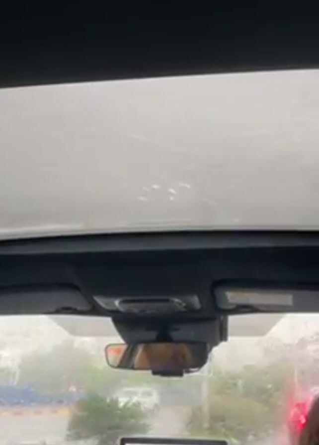 A static shot from the interior of a car shows heavy rain obscuring the view through the windshield and a large sunroof