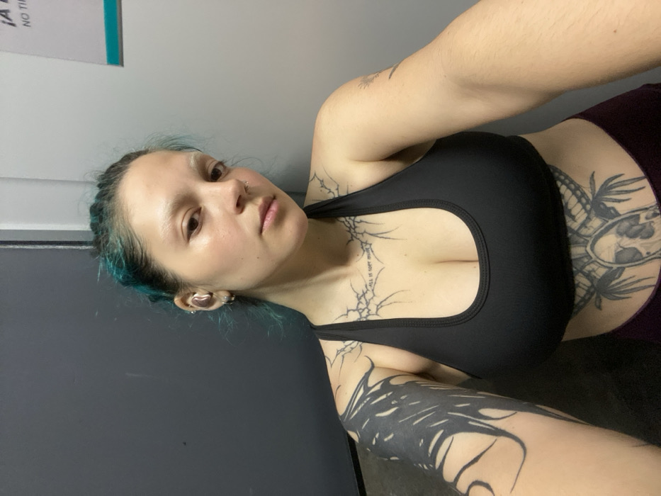 An adult female subject, appearing in a self-portrait style photograph, is depicted from the mid-chest up against a minimalist indoor background. Her hair is dark with visible teal or greenish-blue highlights, styled in what appears to be a loose braid or bun. She has light-colored or bleached eyebrows, a small stud piercing on her left nostril, and multiple piercings on her left ear, including a helix piercing and lobe rings. A purple-toned wireless earbud is visible in her left ear. She wears a black sports bra. Visible tattoos include a large, dark, abstract or tribal design on her left upper arm, a spiderweb-like design with text "ALL IT SOFT MUSE" across her upper chest, and a prominent skull design flanked by ornate elements or palm trees on her abdomen. Her gaze is directed towards the camera with a neutral expression. The background consists of plain gray walls, with a darker gray section to the subject's left and a lighter gray or off-white section to her right, separated by a vertical seam. A partially visible white sign with blue text in the upper right corner reads "¡A NO TIRAR!" (Do not throw away!) and "NO TIRA" (It does not throw). The precise location within the city of Gijón/Xixón is not identifiable from the visual information provided.