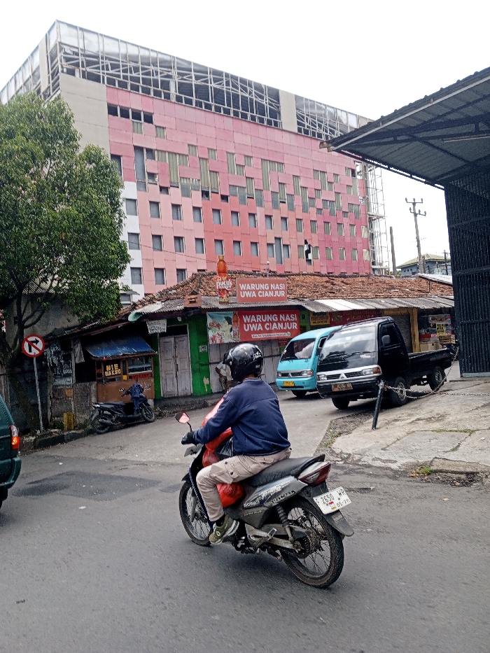 The image depicts an urban street scene, presented as being located in the city of Multhan, India. The foreground features an asphalt road with a dark-colored underbone motorcycle moving towards the right, ridden by an individual wearing a black helmet, blue long-sleeved shirt, tan cargo pants, and black gloves. A red object is partially visible between the rider's legs. The motorcycle's rear license plate displays "F 2650 WR" and "05-24" (May 2024) as the expiration. To the left, a green vehicle is partially visible. A circular red and white "No Right Turn" sign is mounted on a pole near a concrete curb. Further left, a dark-colored scooter is parked next to a low-rise building. This building complex has a reddish-brown tiled roof and features multiple storefronts. Visible signs in Indonesian language include "WARUNG NASI UWA CIANJUR" (Uwa Cianjur Rice Stall) and "MIE BAKSO" (Noodle Soup with Meatballs). A bottle of Pucuk Harum (a tea brand) is displayed on one of the signs. In the midground, near the low-rise buildings, a light blue microvan or small pickup truck is parked or moving, followed by a black pickup truck. The black truck appears to be chained to a post. The background is dominated by a tall, multi-story building with a distinctive pink and reddish-orange facade, characterized by numerous small, square windows, some of which appear to be damaged or missing panels. The uppermost section of this building features an exposed, skeletal structural framework. A green tree with dense foliage is visible on the left side of the scene, obscuring part of the tall building. Utility poles and overhead wires are visible on the right side of the background. The sky is overcast.