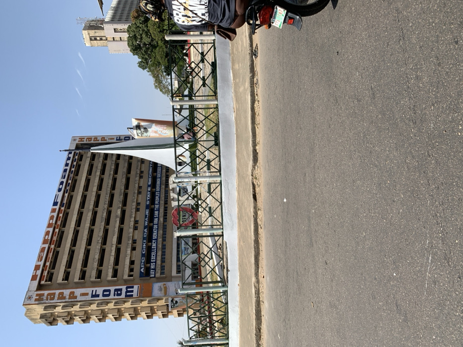 This image captures an urban street scene in Maiburiji, Nigeria, under a clear blue sky